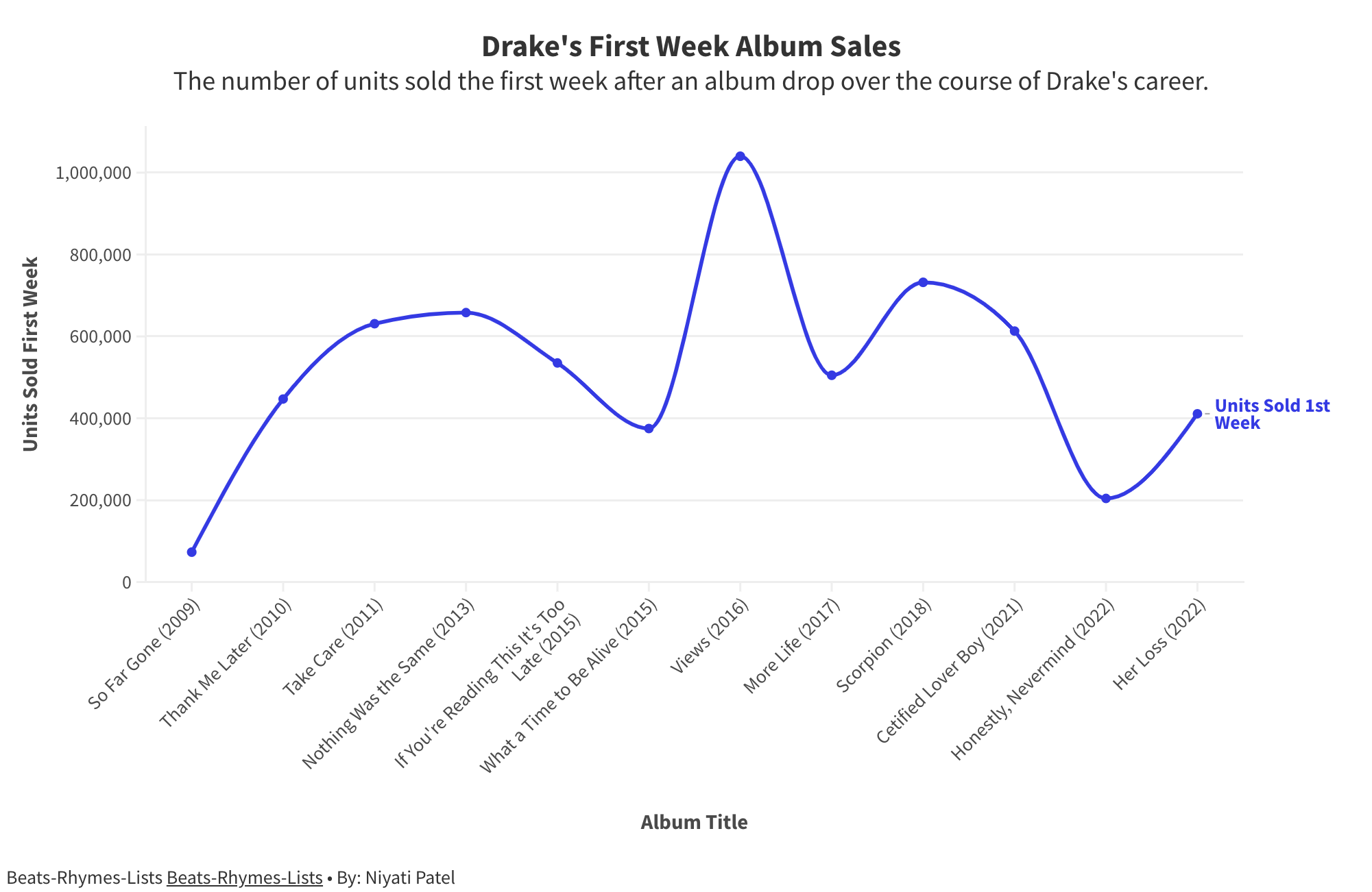 Project 2 consisted of creating graphics related to a relevant news story. This project was completed at the time Drake dropped his 13th studio album, so I based my graphics on the numbers surrounding Drake's career. The featured visualization was created on Flourish and showcases the artists's first week sales for previous albums.
